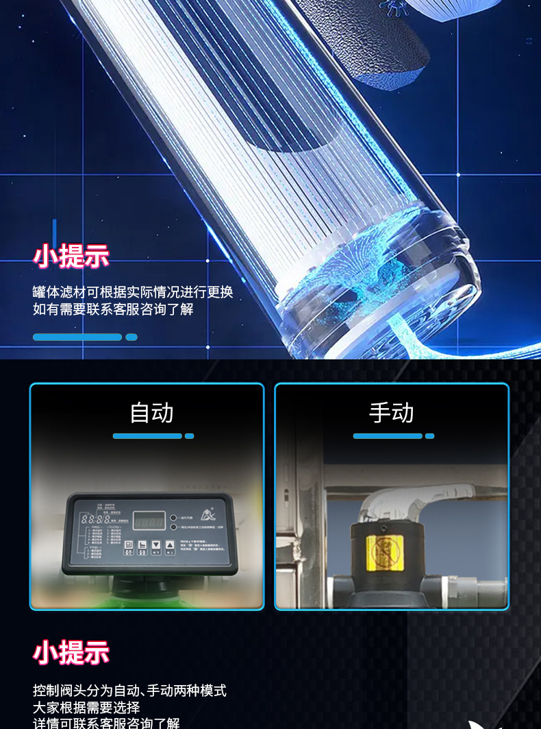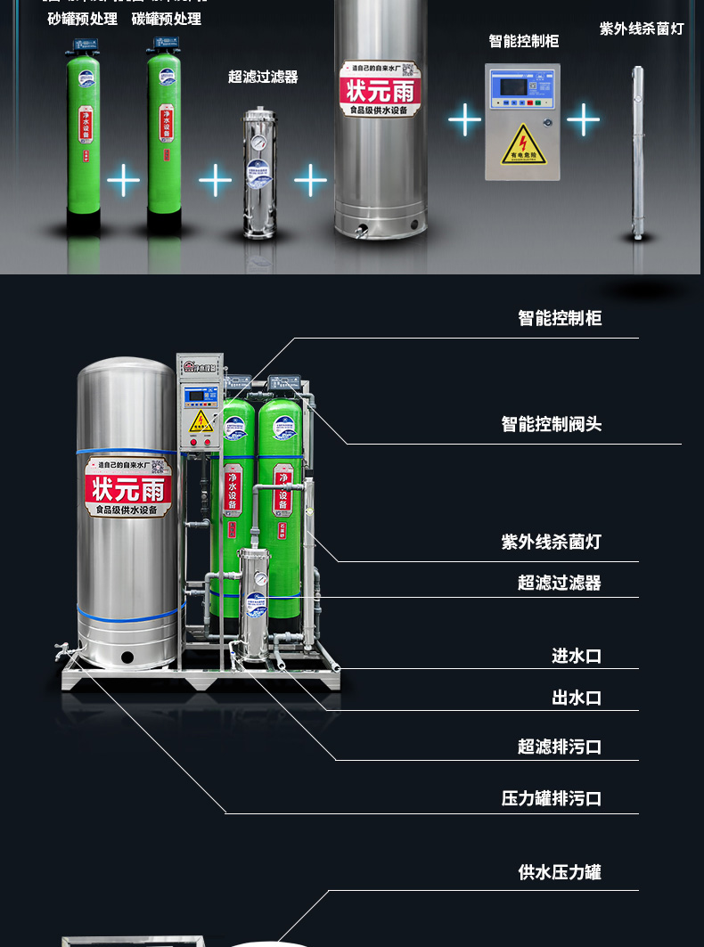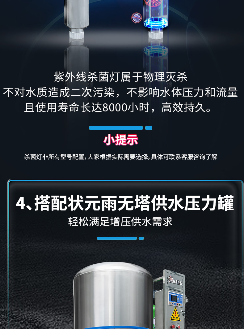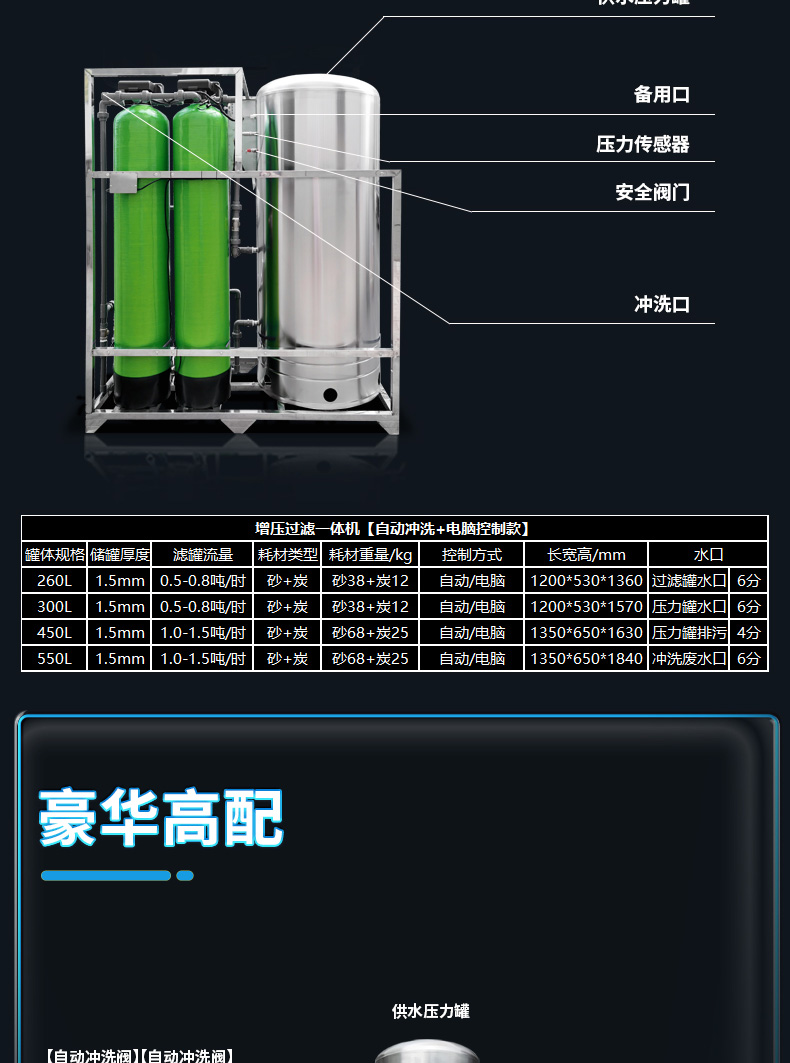 設(shè)備規(guī)格: 260升手動沖洗機(jī)械款砂碳初濾增壓過濾一體機(jī) 260升自動沖洗智能款砂碳初濾增壓過濾一體機(jī) 260升自動沖洗智能款砂碳初濾+超濾過濾器+紫外線殺菌增壓過濾一體機(jī) 300升………… 450升………… 550升…………